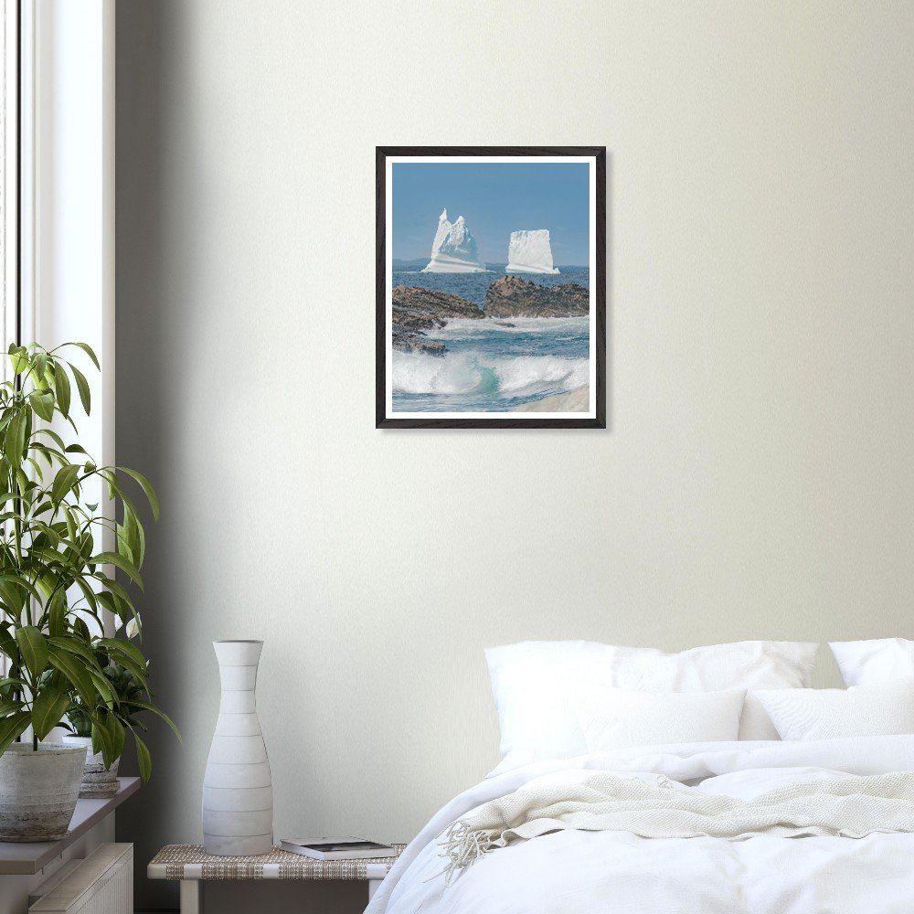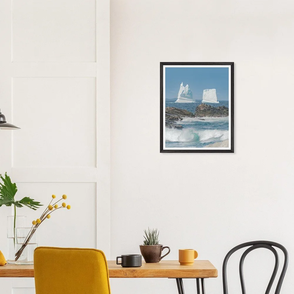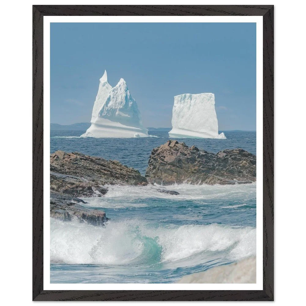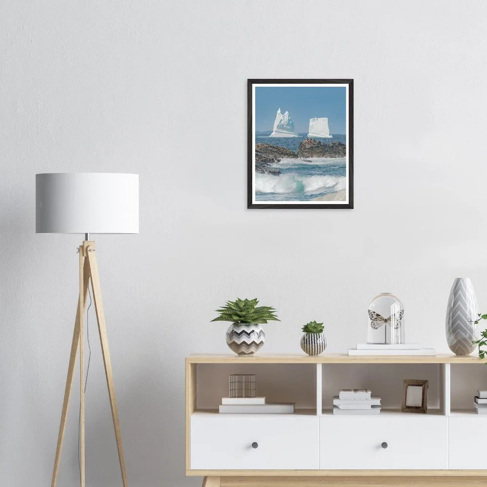 Transform your space with our stunning Framed Iceberg Landscape Print. Captured in Newfoundland, Canada, beautifully depicted with a foreground of a crashing wave against a backdrop of majestic icebergs. Mounted in a sleek black frame with a crisp white matte, this image captures the serene yet powerful nature of the East Coast landscape. Crafted with premium, responsibly sourced oak or ash wood, the frame showcases unique wood grains and enduring quality, making it a perfect focal point for any room. With a 20mm wide and thick frame, thicker than standard options, it offers durability and style. The 200 gsm (80 lb) paper ensures a long-lasting print with a smooth matte finish, while the shatterproof plexiglass adds an extra layer of protection. Available in 16 x 20 inches this will fit with any decor, it's ready to hang straight out of the box with an included hanging kit. Elevate your home aesthetics with this eye-catching artwork, printed on demand for a sustainable choice. Order yours today to enhance your living environment!